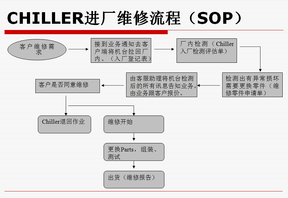 现场不可处理故障:机台拖回我司做现场测试,判断,照顾故障,在既定的时间内出机台到客户端。
